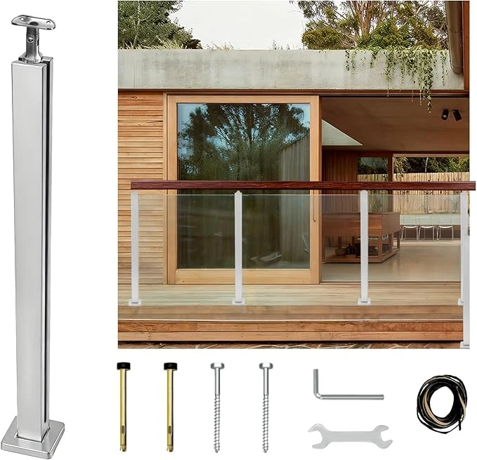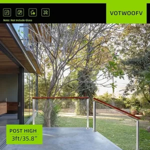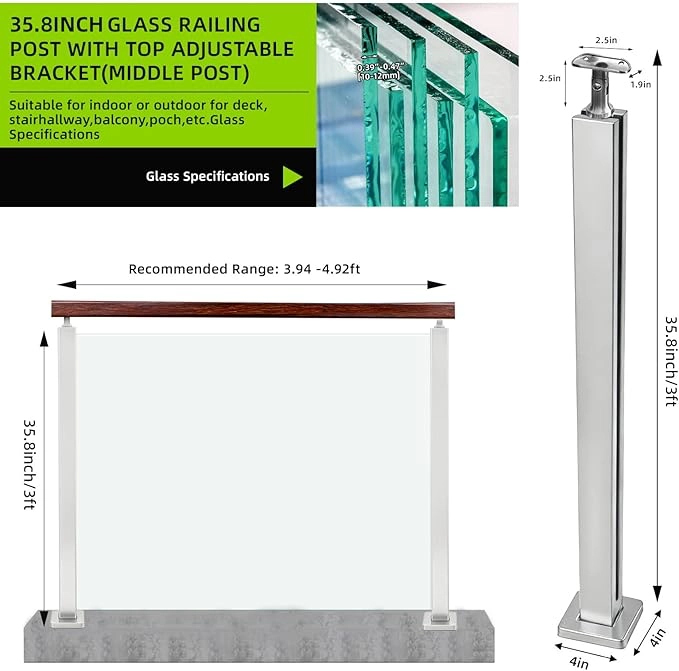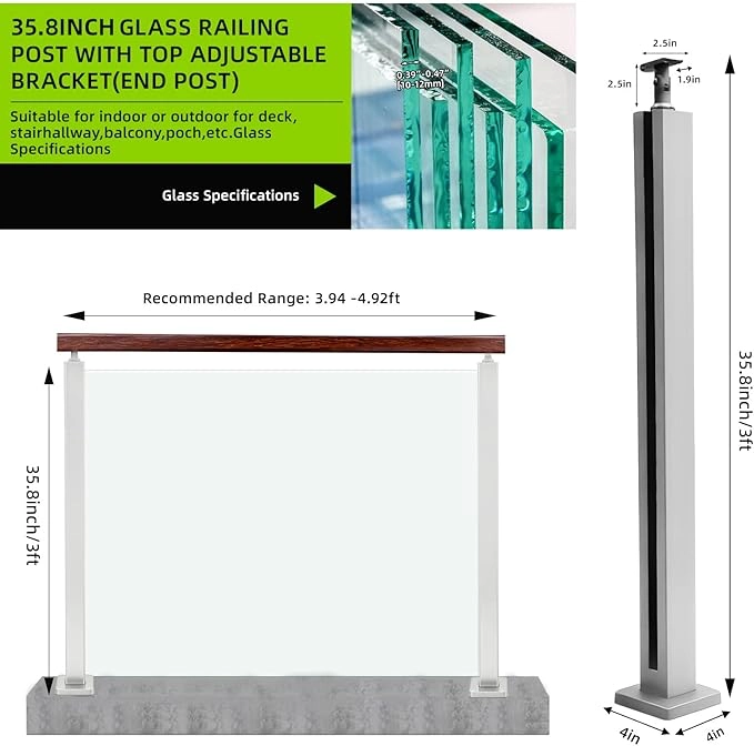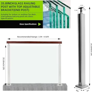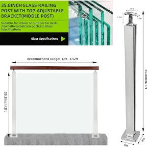35.8″ Glass Railing End Post with Top Adjustable Bracket for Handrails,304 Stainless Steel Glass Balustrade Post with Spigot Slots for Railing of Deck,Balcony,Attic,Staircase (Silver)
